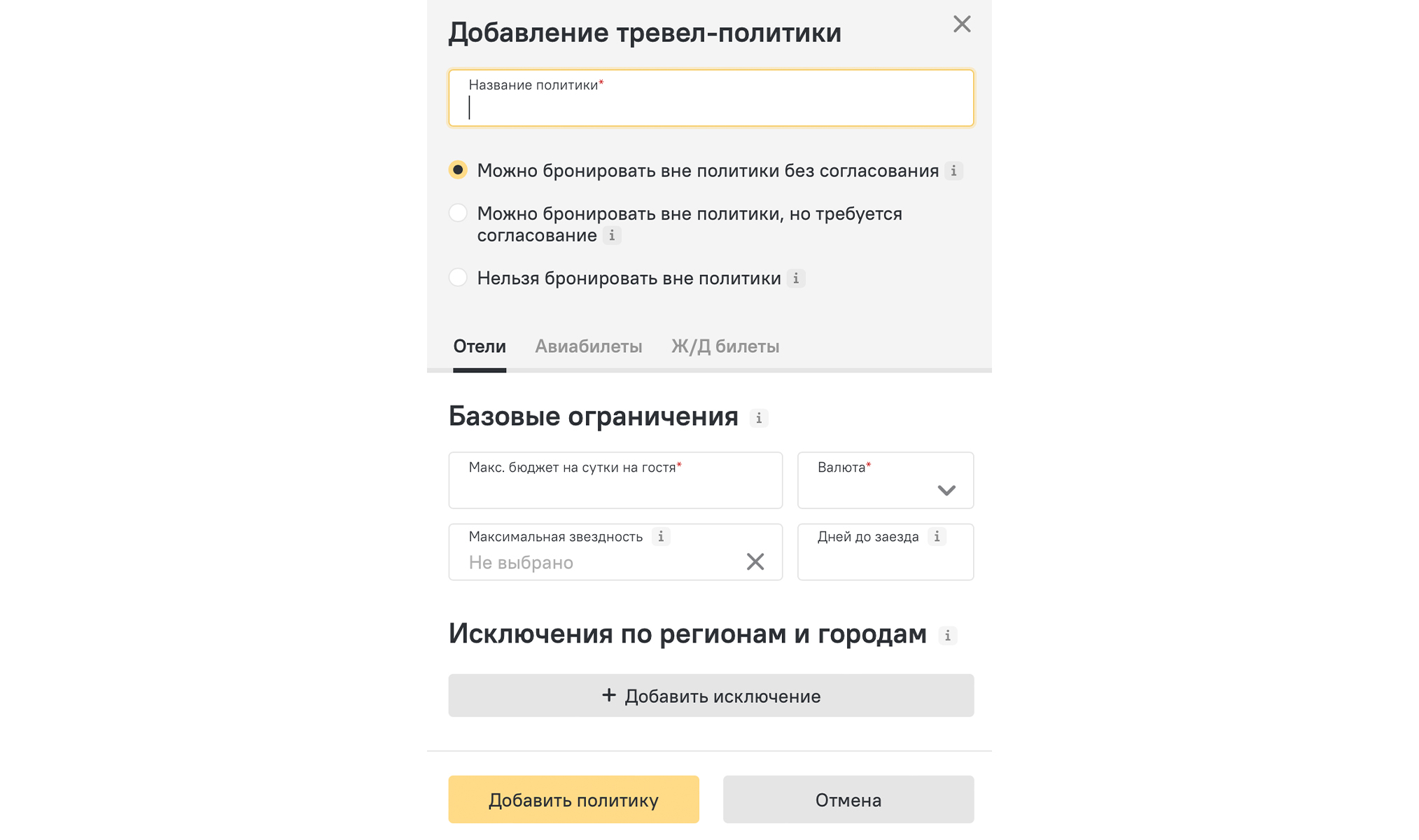 Дополнительная функция — возможность выставлять исключения по странам и городам. Например, разрешить выбор более дорогих отельных тарифов в столице или увеличить бюджетно лимита на отдельных международных рейсах.
