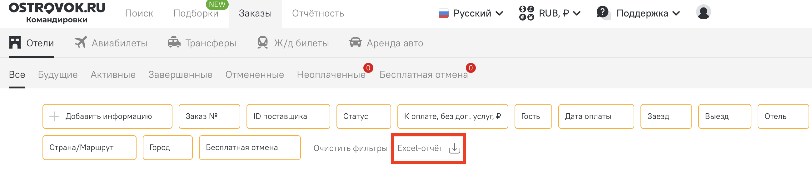 Эксель-отчёты, доступные для скачивания — привычный и удобный способ структурировать данные по бюджету командировок. В Ostrovok.ru Командировки можно выбрать для ознакомления информацию по заказам, сгруппировав данные по номеру договора или маршруту поездки. Затем в один клик скачать сводку в формате таблицы Excel.