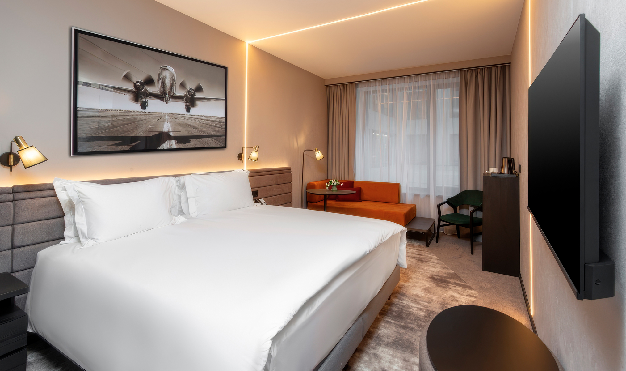 В отеле — 253 номера категории 5* с рабочей зоной, Wi-Fi, мини-баром, блэкаут-шторами и кроватями с ортопедическими матрасами. Для длительного проживания подойдут апартаменты 4* с оборудованной кухней. Всем гостям доступны прачечная, химчистка, фитнес- и спа-зона.