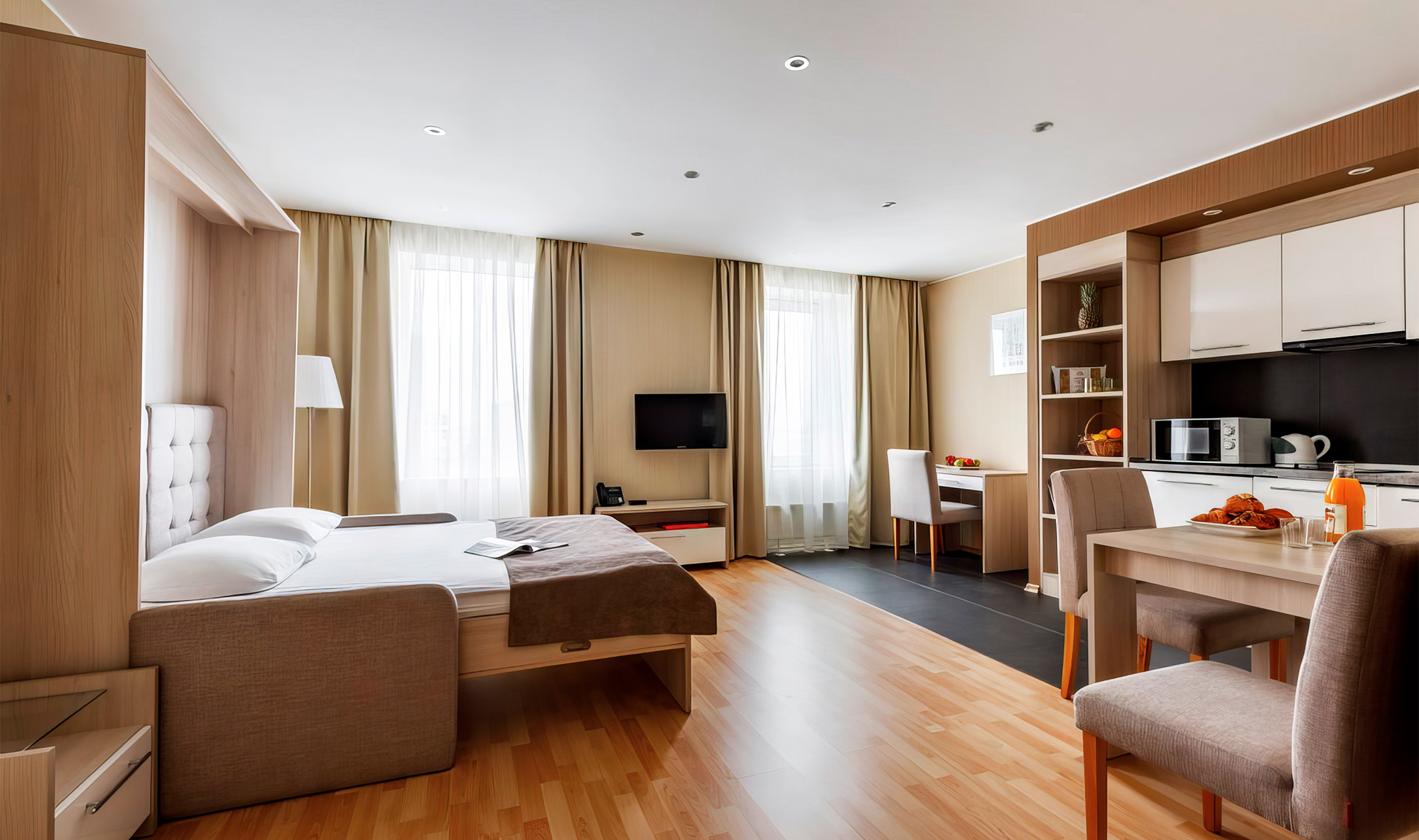 Номера оснащены рабочим пространством и кухней, при этом готовить самим необязательно, если выбрать тариф с завтраком.