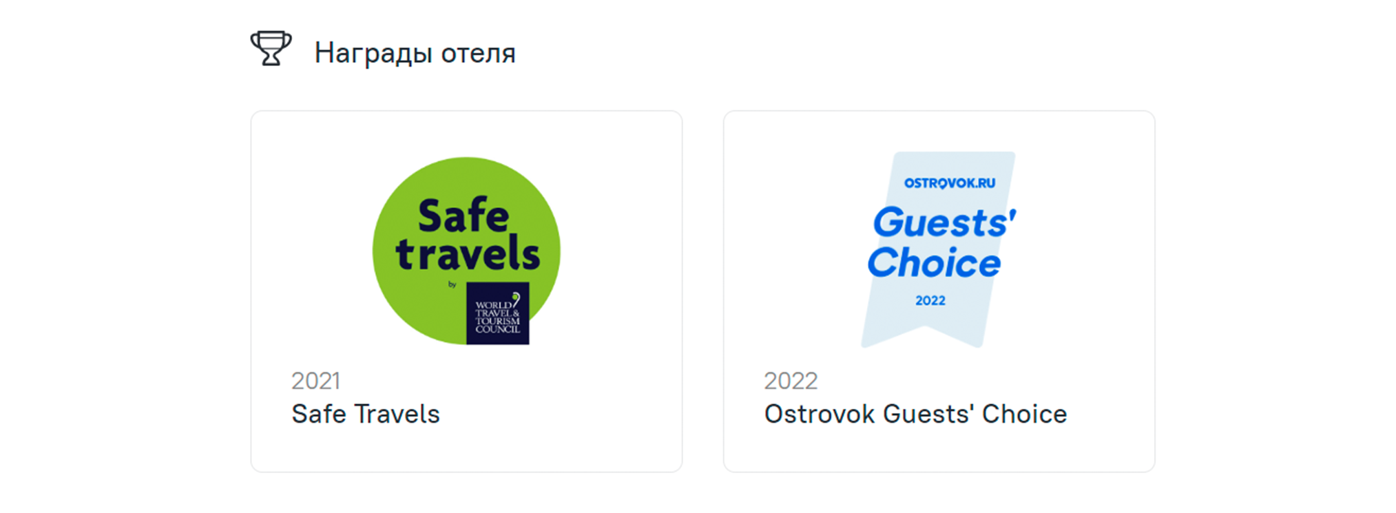 - Значок Ostrovok Guests’ Choice с указанием года также можно увидеть в разделе «Награды».