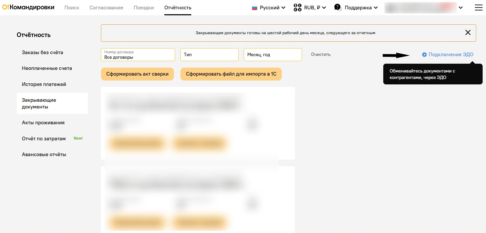 2. Подключите ЭДО в Островок Командировки. Зайдите в личный кабинет, перейдите в раздел «Отчётность» и нажмите вкладку «Закрывающие документы». В правом углу кликните кнопку «Подключение ЭДО».