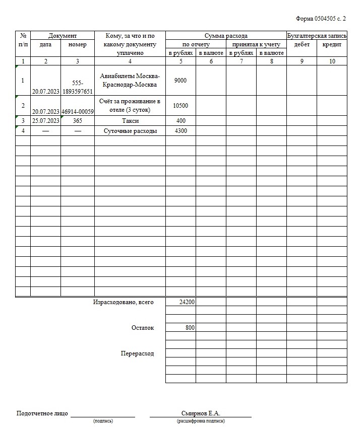 Для наглядности посмотрите пример полного заполнения авансового отчёта.