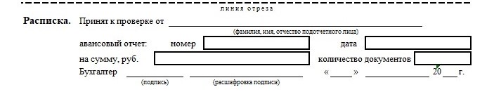 Когда отчёт готов, бухгалтер отрезает от него расписку — корешок, расположенный в нижней части лицевой стороны документа. Расписка остаётся у сотрудника.