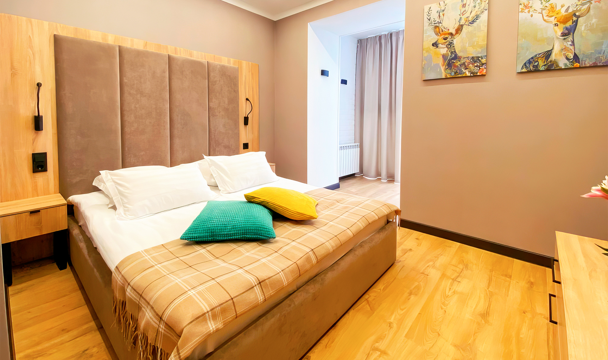Для тех, кому важно чувствовать себя как дома во время командировки. В номере есть всё необходимое: микроволновка, холодильник, полный набор посуды, стиральная машина, утюг, гладильная доска. Цена за апартаменты начинается от 3694 руб.
