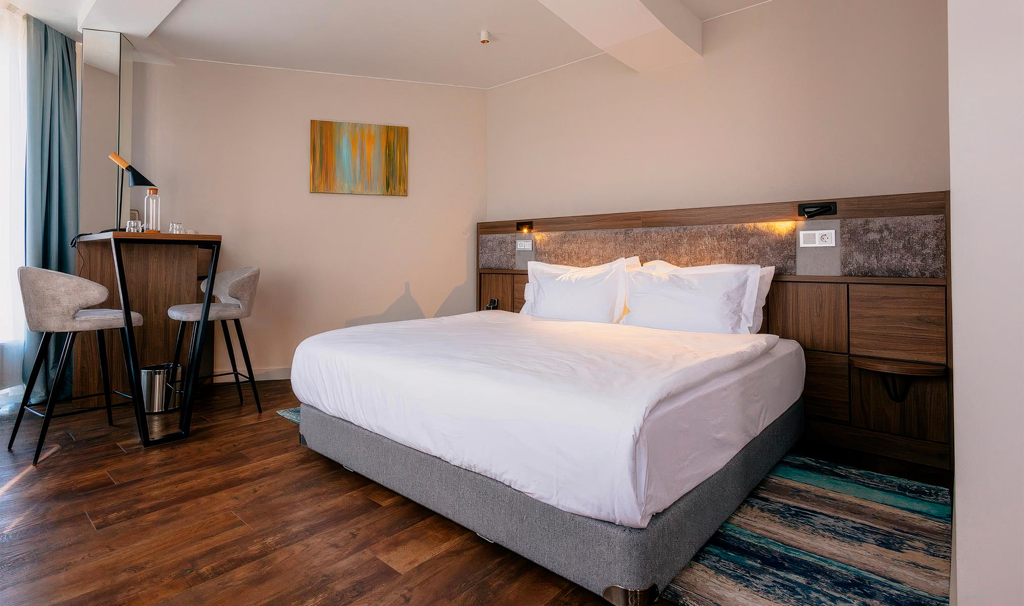 Здесь точно удастся выспаться: в каждом номере — усиленная шумоизоляция, удобные матрасы и шторы блэкаут. Для отдыха и работы есть удобный рабочий стол с розетками для подключения ноутбука, чайная станция, халат, фильтрованная вода и премиальная косметика. В апартаментах дополнительно предусмотрели зону кухни, обеденное пространство и мини-прачечную — всё для того, чтобы гости почувствовали себя в командировке как дома.