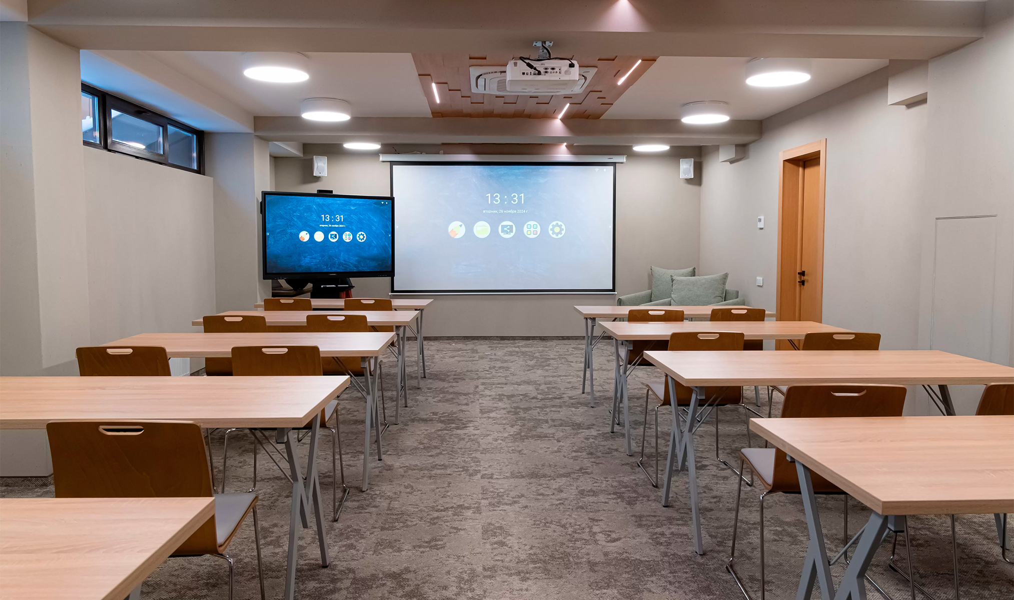 В отеле есть конференц-зал на 60 человек с проектором, экраном и многофункциональной доской. Пространство легко трансформируется: можно расставить столы для семинаров или организовать театральную рассадку для презентаций. Рядом с залом есть зона для кофе-брейка или фуршета.