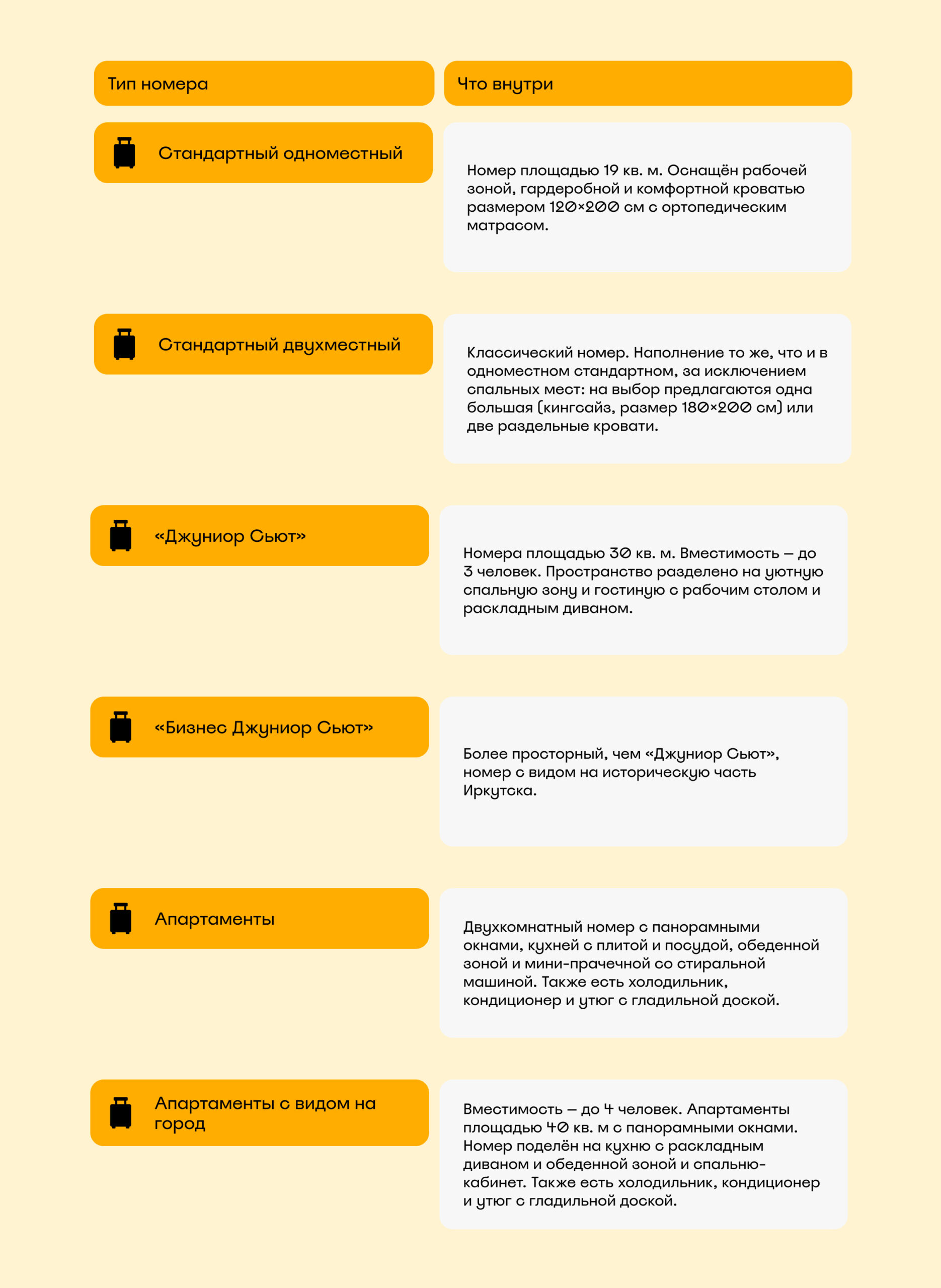В отеле 28 номеров, в которых будет приятно расслабиться после долгого перелёта в Иркутск или напряжённого рабочего дня.