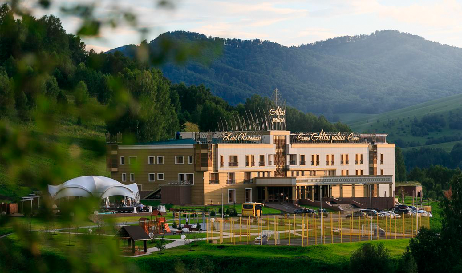 Четырёхзвёздочный Altai Palace занимает обширную территорию в предгорье горы Каим рядом с посёлком Манжерок.