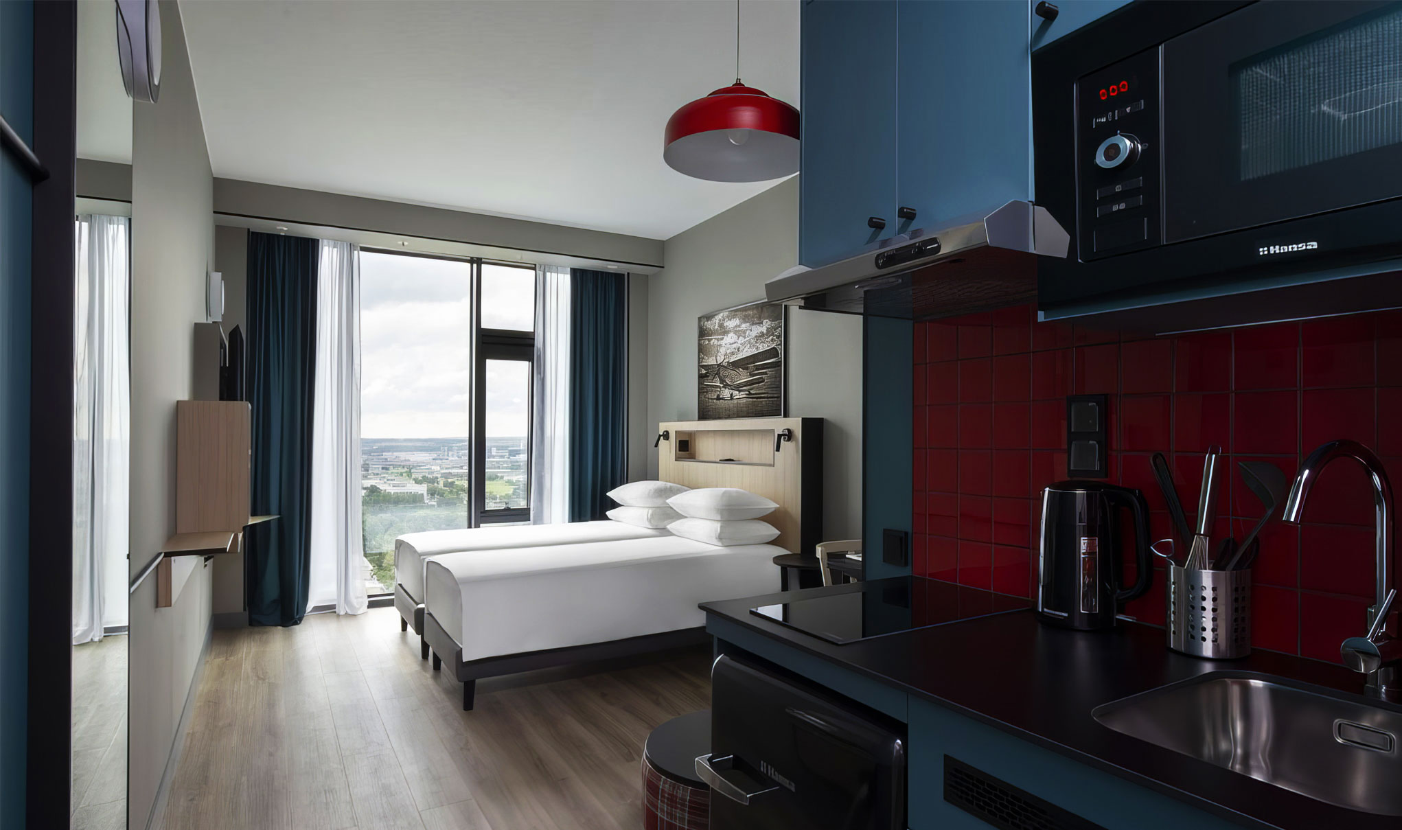 К услугам гостей 479 номеров-апартаментов, в каждом есть мини-кухня с полным набором посуды, всё для чая и кофе, халаты и тапочки. В комнатах повышенная звукоизоляция и ортопедические матрасы для комфортного сна.
