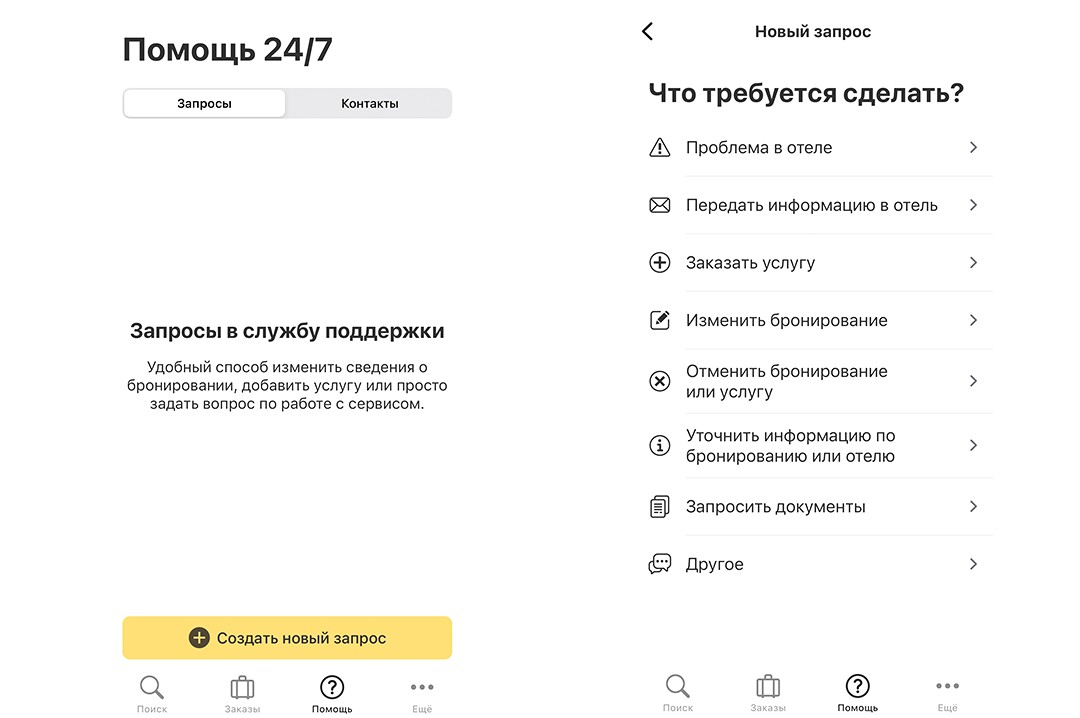 Если вы находитесь в карточке заказа, по которому есть вопрос, переходить в раздел «Помощь» необязательно — форма запроса будет сверху информации о бронировании.