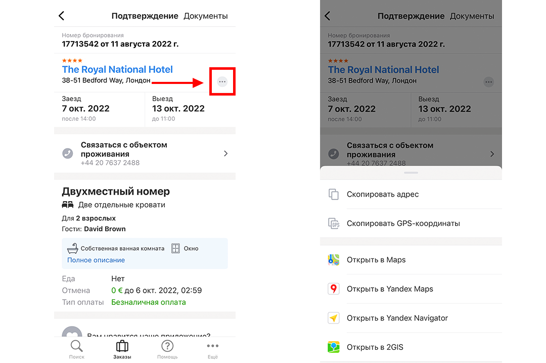 Нужно предупредить отель о позднем заезде или уточнить наличие свободных мест на парковке? Удобнее всего это сделать, позвонив на ресепшн, поэтому в карточке заказа есть телефон отеля и кнопка быстрого вызова.