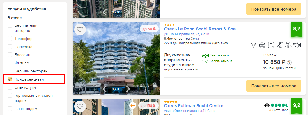 Если вы рассматриваете отель для организации конференции или другого мероприятия, воспользуйтесь фильтром «конференц-зал» на странице с поисковой выдачей.