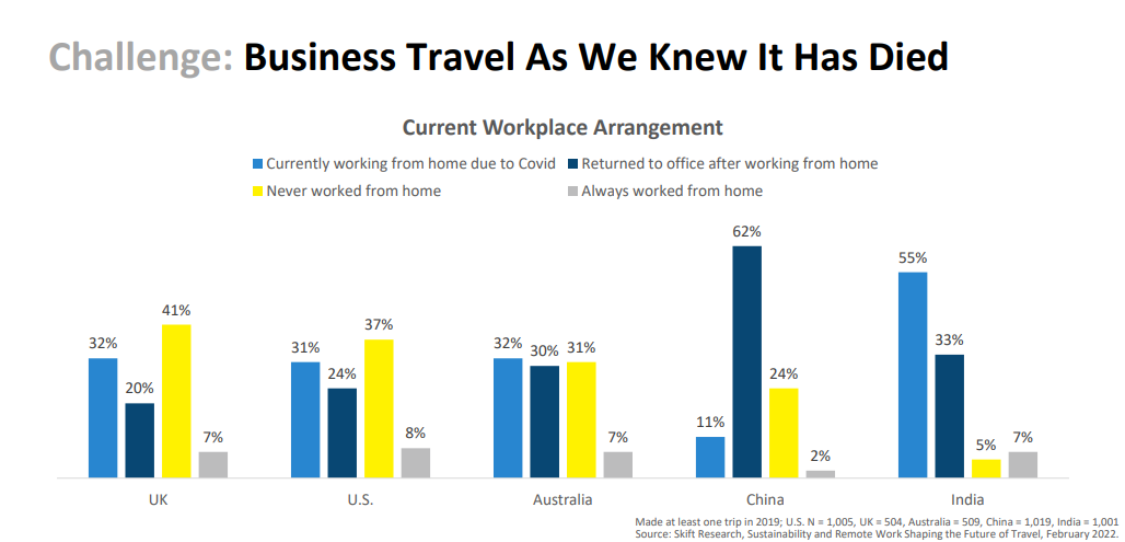 Согласно опросам Skift в Великобритании, США и Австралии около 30% сотрудников продолжают работать из дома, несмотря на снятие большей части ограничений, и не планируют возвращаться к офисной жизни. При этом удалённая работа из любой точки мира открывает дополнительные возможности для индустрии. Так, отели адаптируются под удалённых сотрудников и добавляют услуги, исходя из нового подхода к жизни и работе. Появляются удобные системы бронирования ресторанов, конференц-залов и других услуг для бизнес-мероприятий.