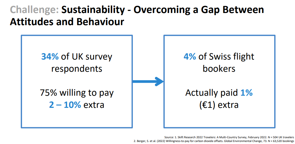 Однако эксперты отмечают разницу в желании соблюсти принципы устойчивого развития при выборе направления и реальными расходами. Согласно опросам 34% британских путешественников готовы платить больше, чтобы их путешествие не вредило планете. При этом лишь 4% пассажиров Swiss Air платят надбавку за экологичность в размере одного евро.