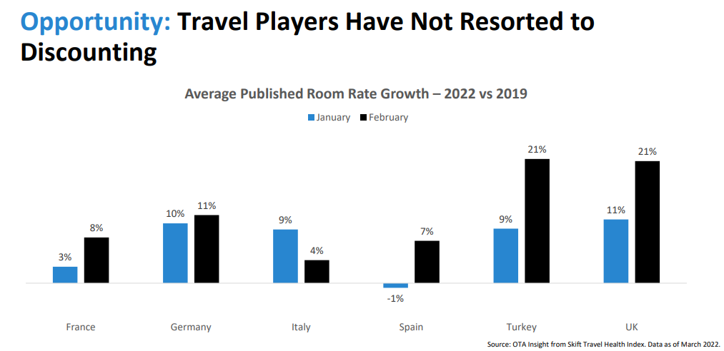 По данным Skift, предоставляемые скидки на гостиничные номера все еще ниже допандемийного уровня. К примеру, средняя скидка на гостиничный номер в Великобритании до пандемии была 21%, а в начале этого года составляет лишь 11%. Забронировать номер в турецком отеле в 2019 году можно было со средней скидкой в 21%, а в начале этого года лишь со скидкой в 9%. Похожая тенденция применима к большинству европейских стран.