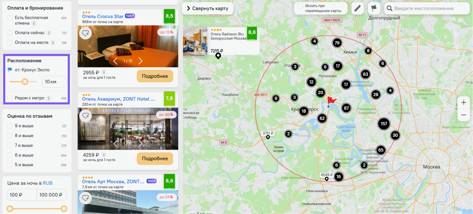 В фильтре «Расположение» можно настроить показ гостиниц по удалённости — от 500 метров до 30 км.