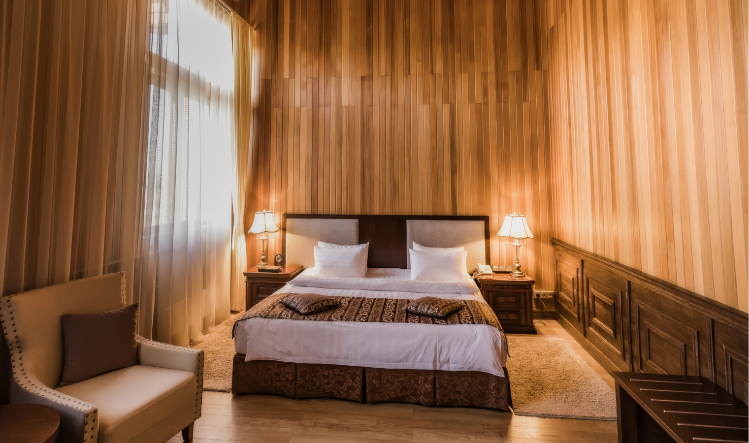 Все номера категорий стандарт, люкс и джуниор сьют отделаны элитным канадским кедром и выделяются необычными потолочными сводами.