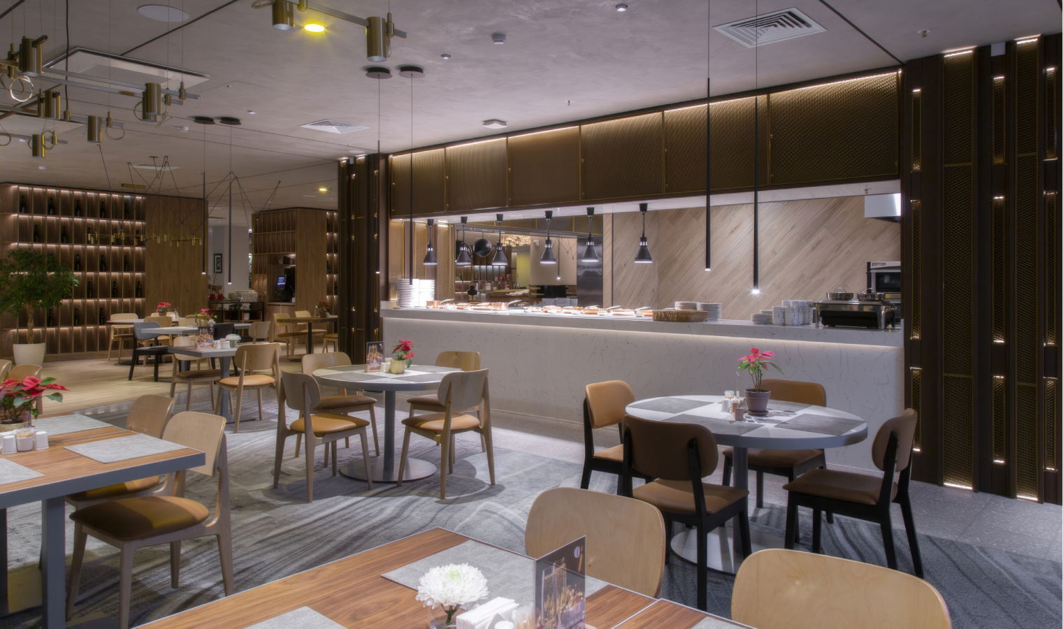 Ресторан Space by Cosmos предлагает завтраки (шведский стол), обеды и ужины. В круглосуточном лаундж-баре можно провести встречу в неформальной обстановке. Для семинаров и тренингов доступны конференц-залы: «Вена» на 10 человек, «Стамбул» на 47 гостей, а также объединённые «Париж» и «Лондон» для мероприятий до 82 участников.