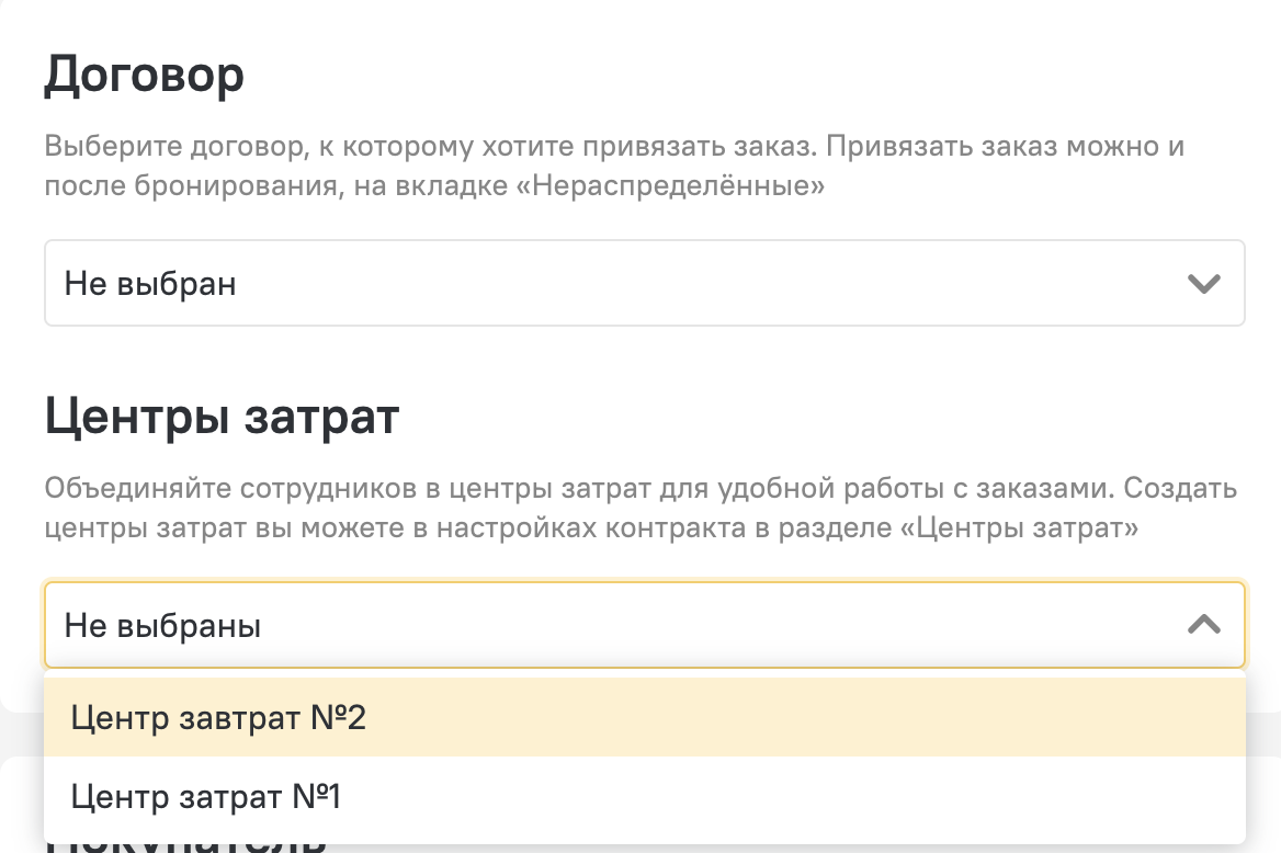 Раньше договор и центр затрат можно было выбрать на странице заказа, теперь их можно указать сразу на странице бронирования.