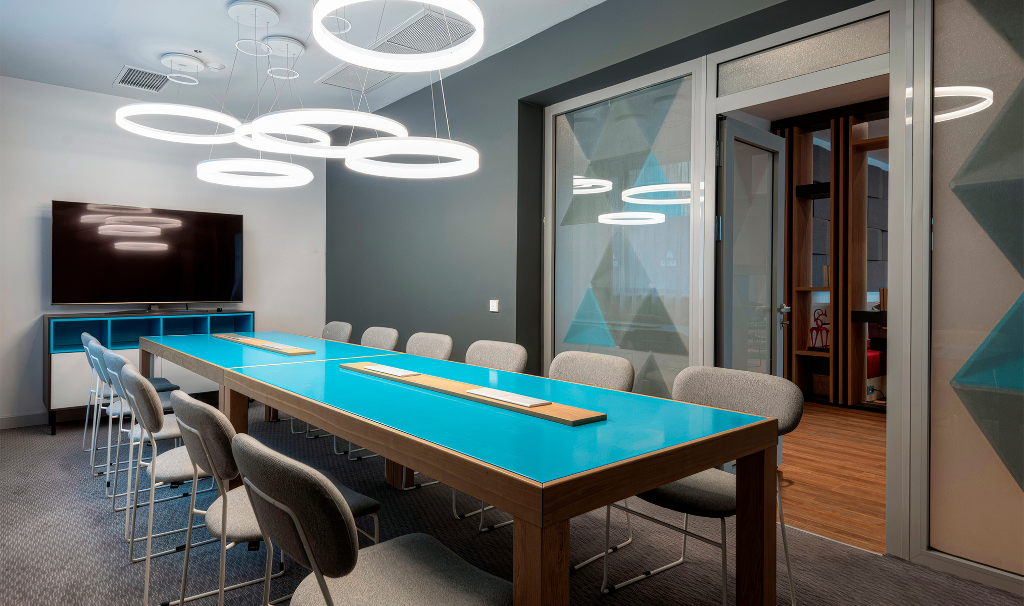 Переговоры и встречи можно провести в небольшом конференц-зале «Алматы» на первом этаже здания.