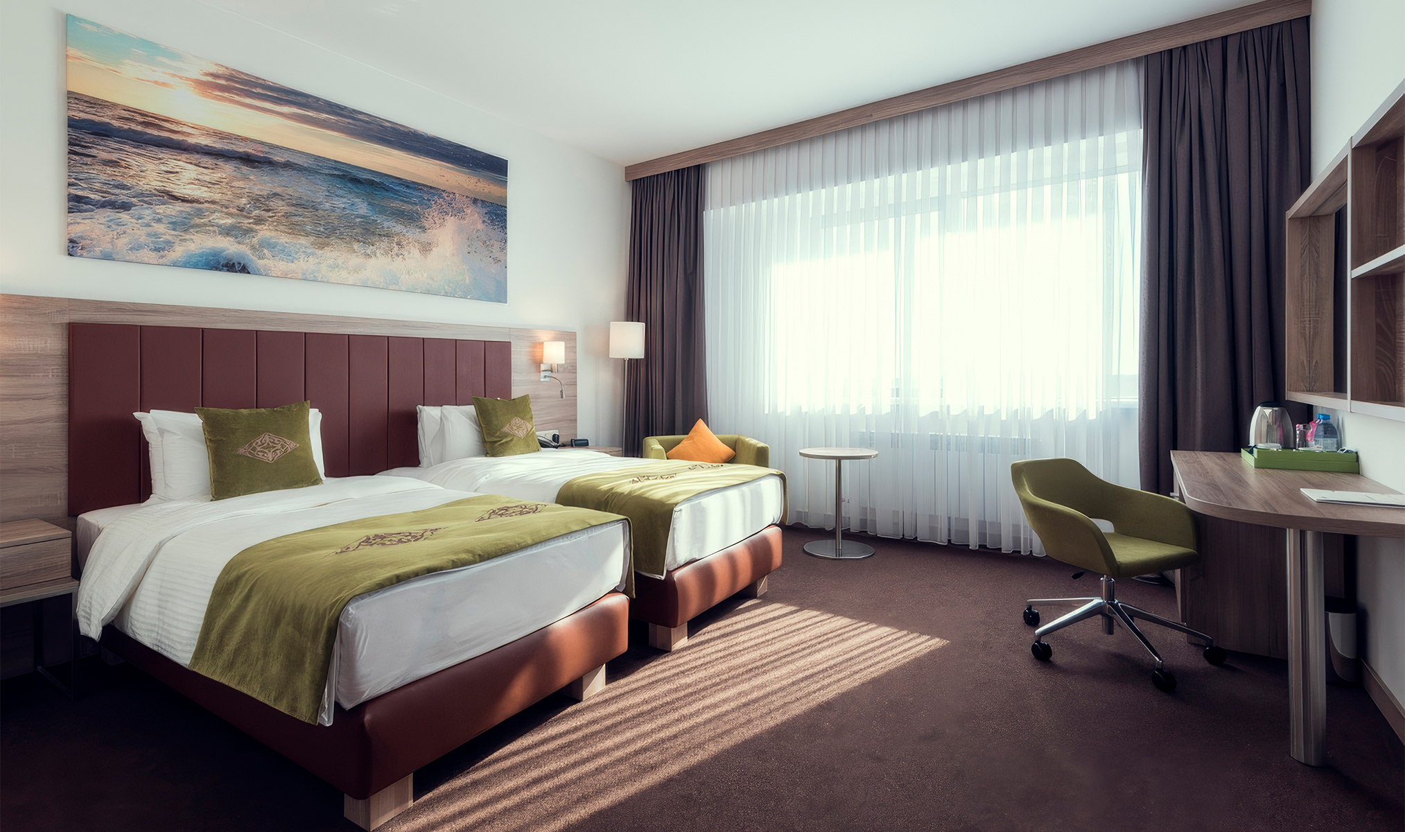 Один из самых роскошных бизнес-отелей страны. Здесь светлые номера с письменными столами и панорамным видом на город, а также спа-центр с бассейном, входящий в число крупнейших в Астане.