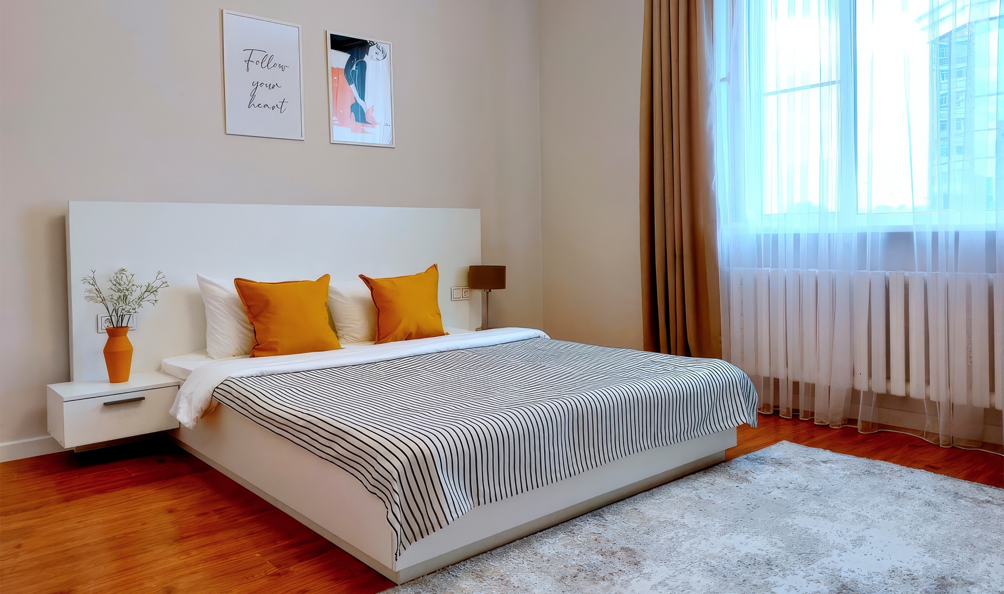 Гость в этих апартаментах может заселиться в удобное время по электронному ключу. А расположение в самом сердце Астаны — рядом с башней «Байтерек», парком, множеством ресторанов и кафе — позволит сэкономить на транспорте.