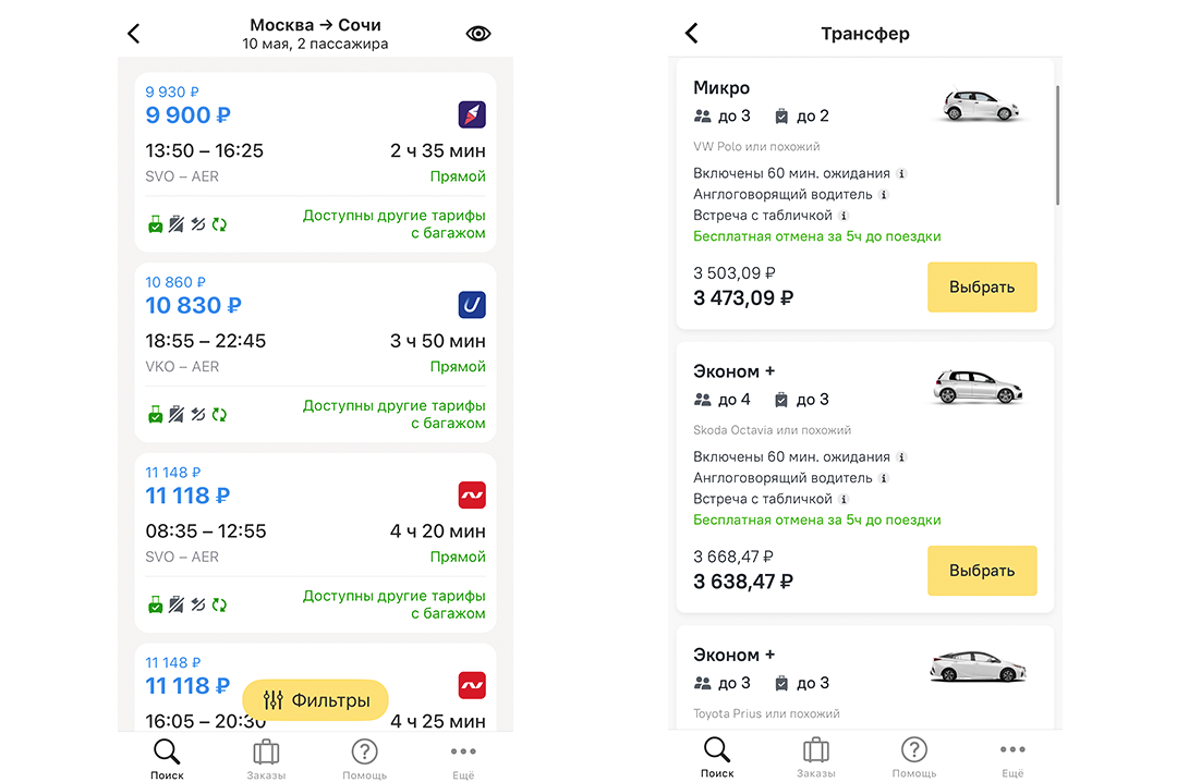 Добавили возможность бронирования авиабилетов и трансферов в мобильном приложении