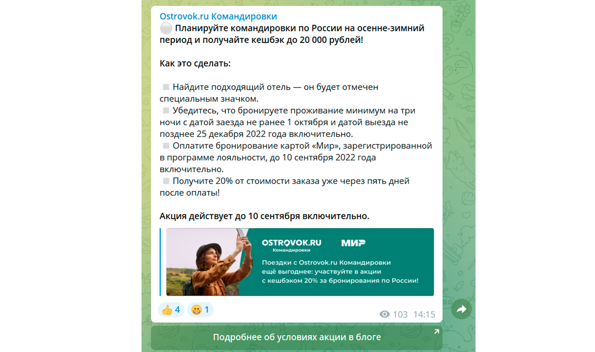 При планировании командировок по России на осенне-зимний период можно было получить кешбэк на карту «Мир» до 20 000 рублей, и этой возможностью воспользовались тысячи бизнес-туристов! Средний чек бронирования на наших сайтах составил 25 400 рублей за пять ночей, а самыми популярными направлениями стали Санкт-Петербург, Сочи и Москва.