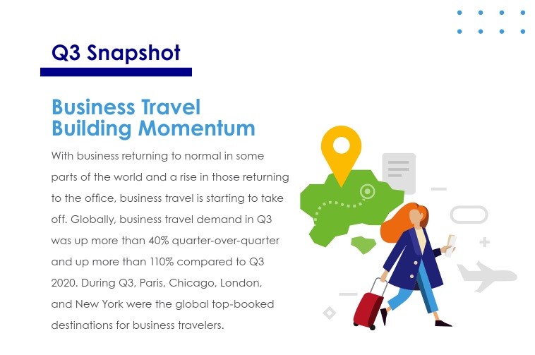 Бизнес-туризм восстанавливается и стремится к допандемийному уровню. Всё больше сотрудников возвращаются в офисы, а мероприятия переходят в офлайн. В третьем квартале 2021 года спрос на деловые поездки увеличился на 40% по сравнению с предыдущим кварталом, а также на 110% по сравнению с аналогичным периодом прошлого года.