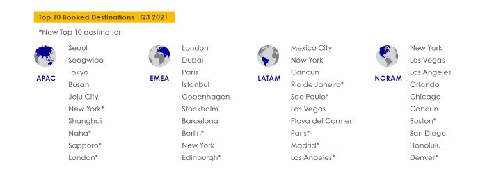 В глобальном масштабе третий квартал 2021 года показал значительные изменения в списке самых популярных направлений для командировок. Лучший результат в рейтинге по бронированию в сентябре показал Дубай, переместившись с 33-го на 10-е место и укрепив звание популярного направления для бизнес-туризма. Одной из причин могла стать Всемирная выставка «Экспо 2020», которая открылась 1 октября 2021 года.