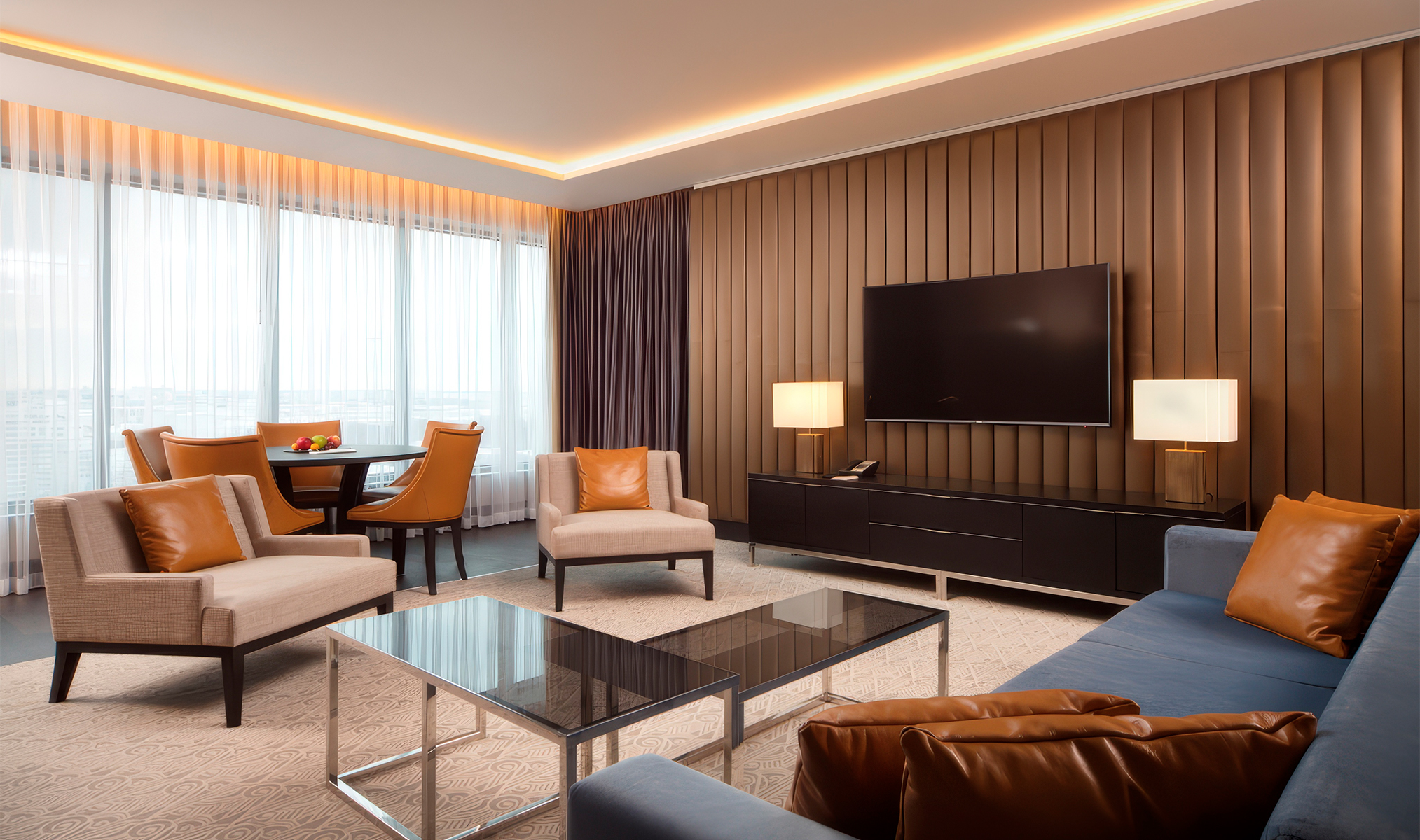 Интерьер отеля выполнен в стиле ар-деко с использованием натуральных материалов: белого мрамора, дерева, кожи и стеклянных панелей.