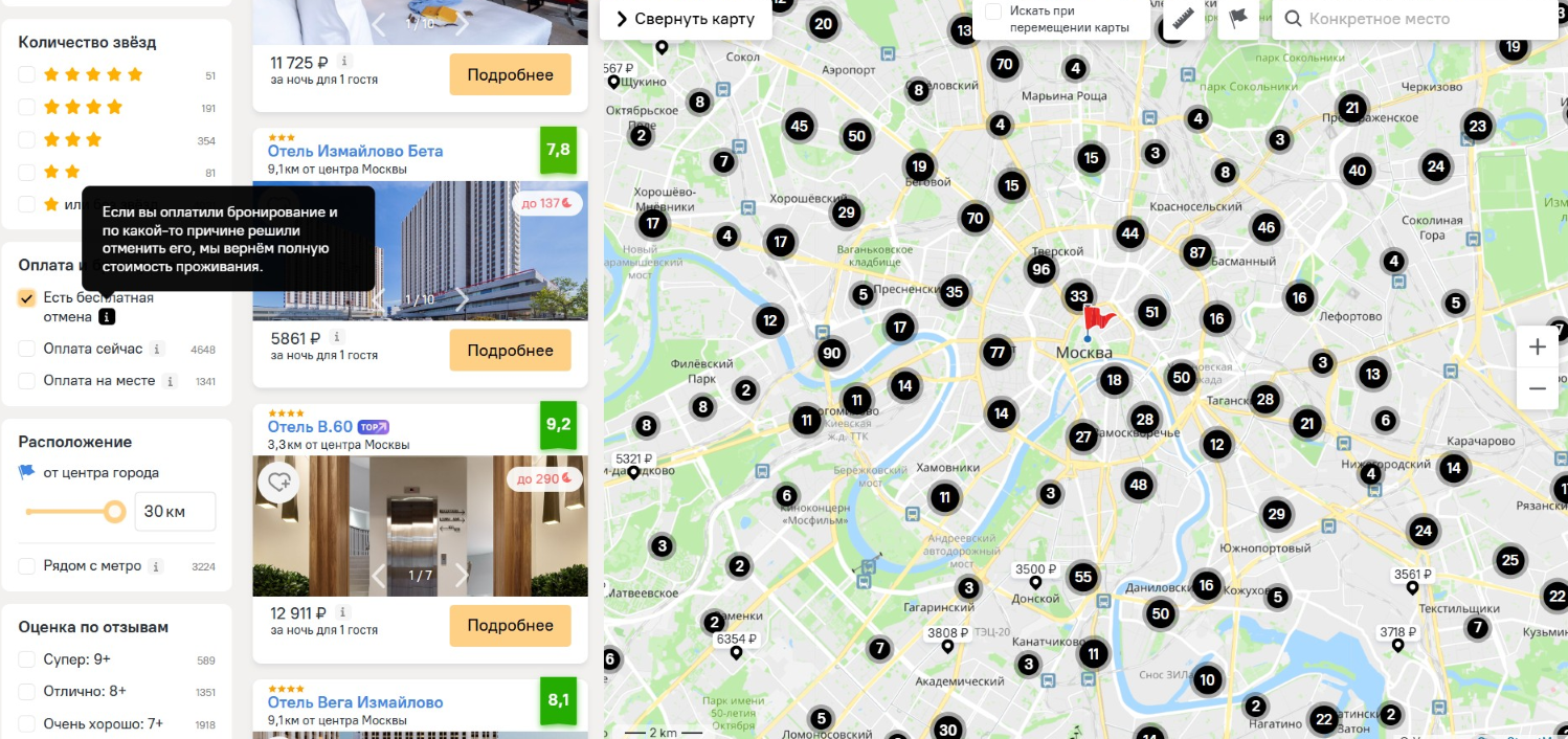 Например, в сервисе Островок Командировки можно отсортировать такие варианты с помощью фильтра «Оплата и бронирование». Но следует помнить о нюансе: обычно бесплатная отмена ограничена сроком, который можно узнать при выборе тарифа и оплате проживания. Если срок пропустить, то есть шанс не вернуть деньги или получить обратно только часть стоимости. В последнем случае команда поддержки сервиса может обратиться к отелю и попробовать минимизировать штраф или избежать его.