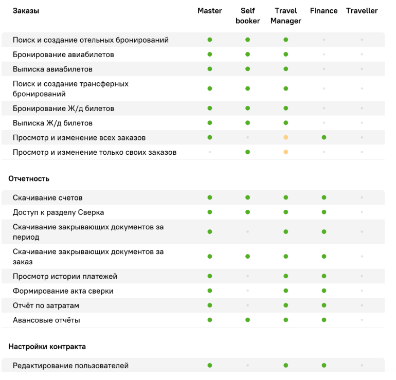 У каждой роли пользователя в Островок Командировки есть свой набор возможностей и уровней доступа.