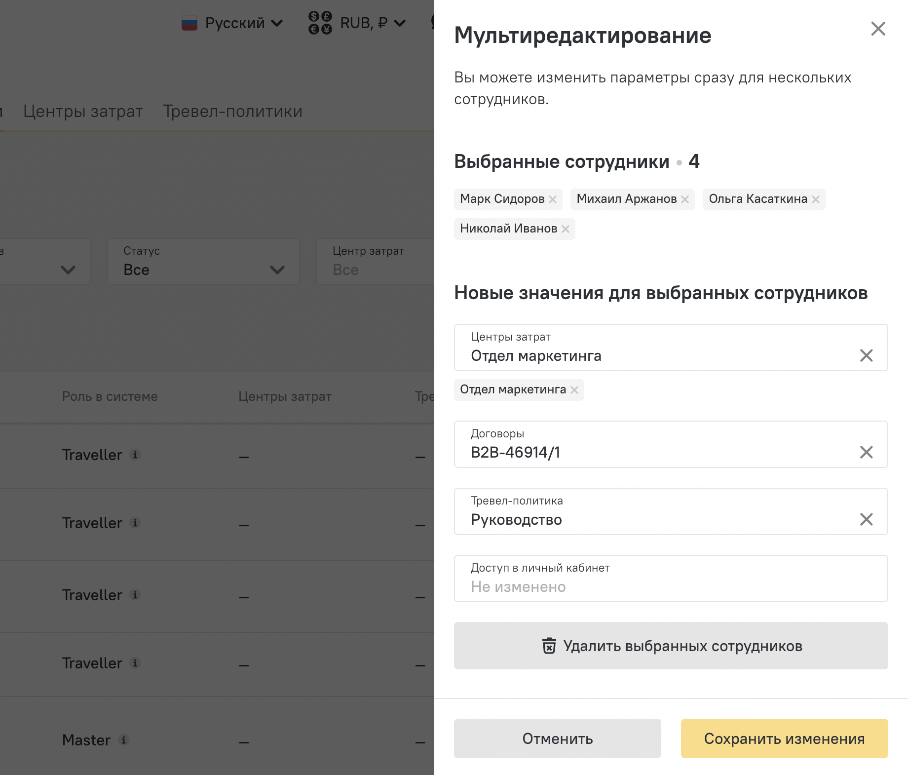 - Изменить закрепленные за сотрудниками центры затрат или тревел-политики.