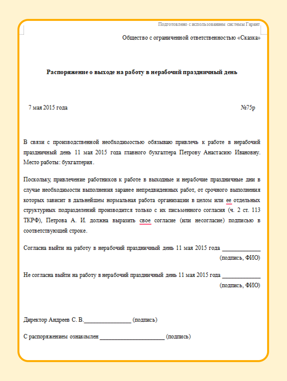 Распоряжение в свободной форме о привлечении сотрудника на работу в праздничные дни.