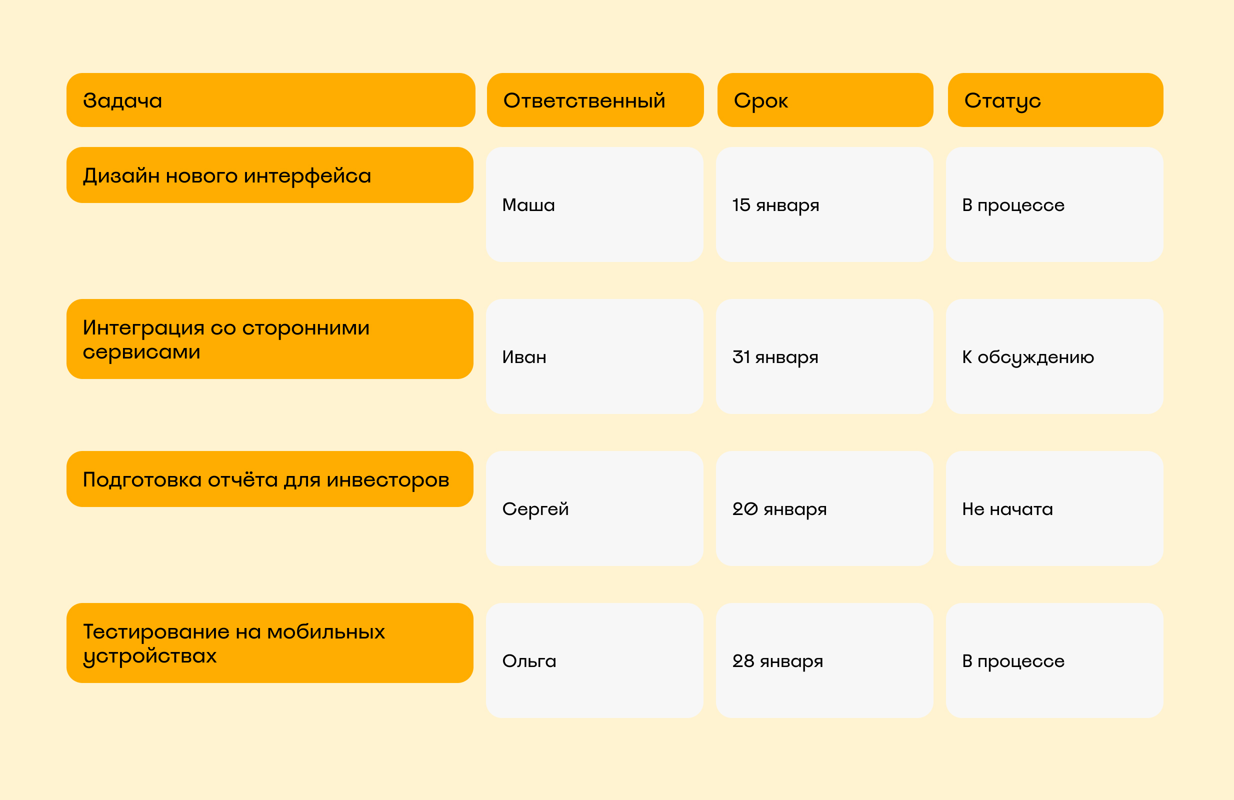 Представьте участников. Это занимает несколько минут, при этом задаёт тон всей встрече. Если люди незнакомы друг с другом, попросите каждого кратко сказать, кто они, на каком проекте работают и что конкретно ждут от совещания. Это особенно важно для междисциплинарных команд, где маркетолог, разработчик и дизайнер могут впервые договариваться о чём-то совместно.
