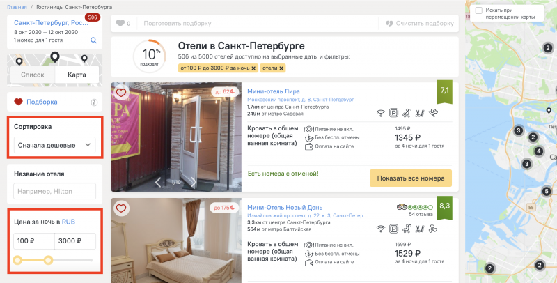 Используйте сортировку по цене, чтобы сразу увидеть самые бюджетные варианты проживания.