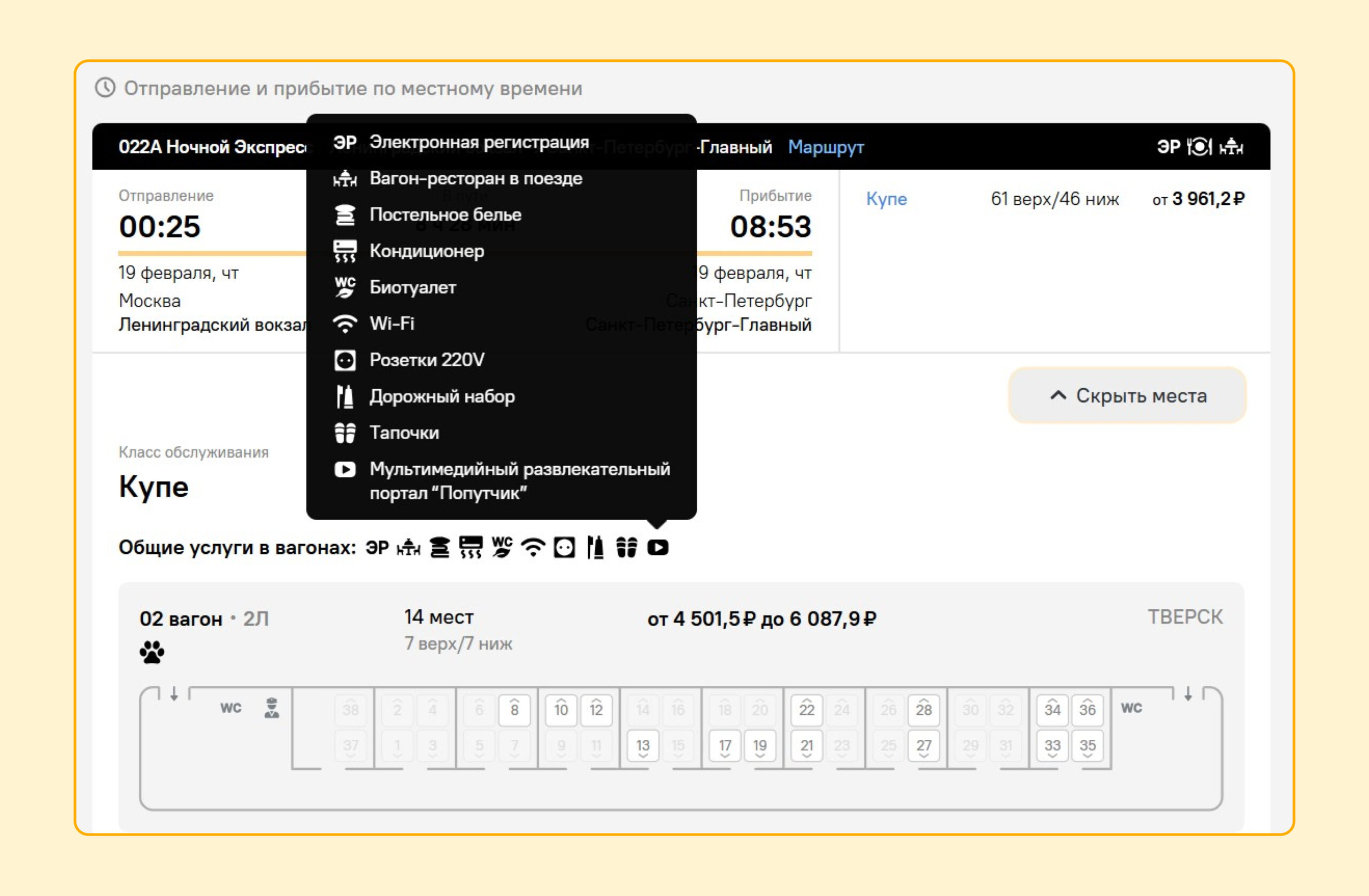 - Класс вагона с необходимыми услугами: например, приобретать билеты в купе, где есть розетки и вайфай, чтобы поработать в дороге.