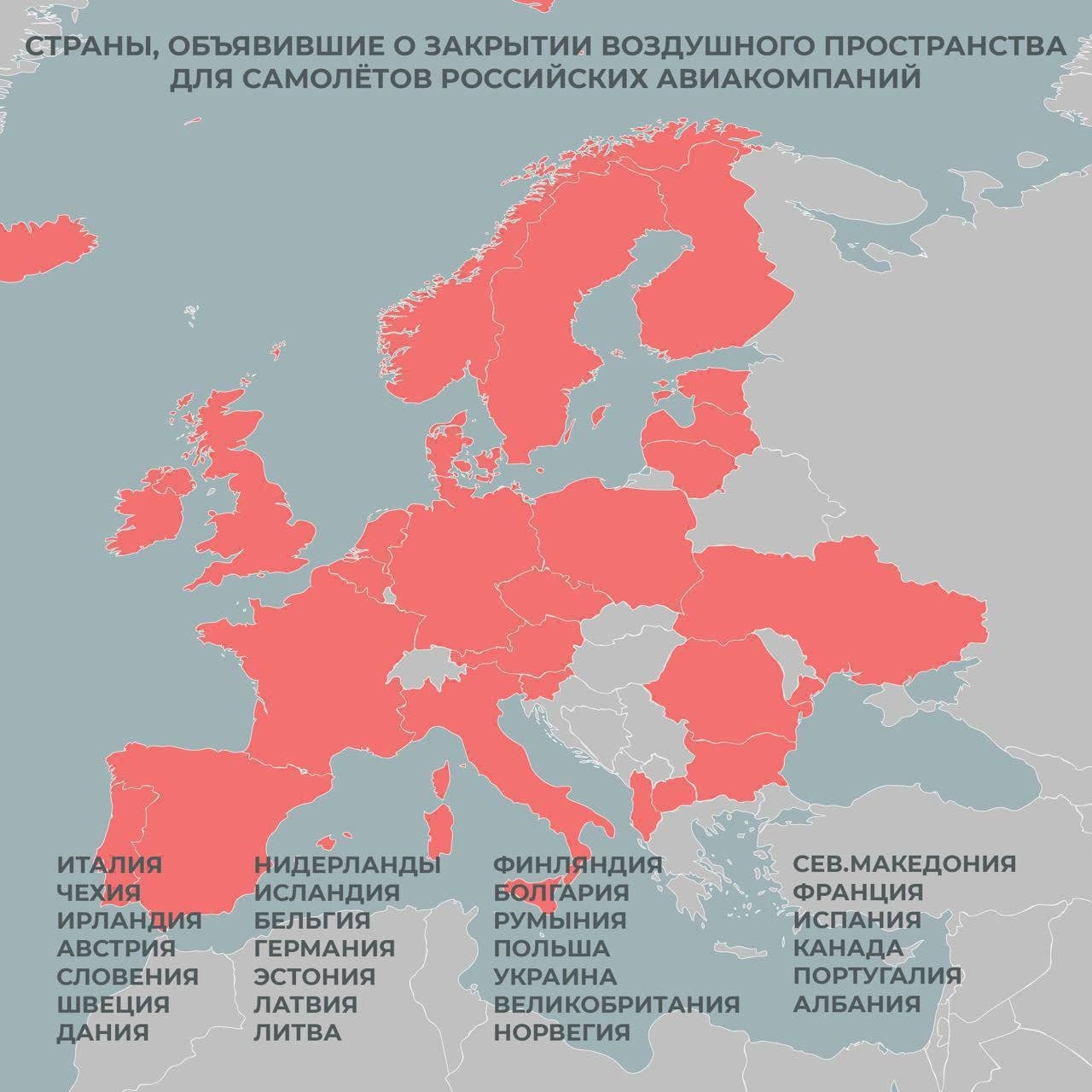 По состоянию на 28 февраля 2022 года воздушное пространство для российских самолётов закрыли следующие страны: