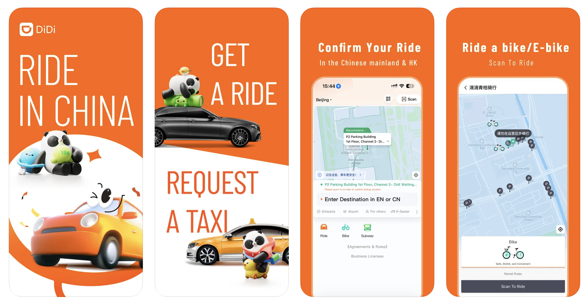 Скриншоты приложения Didi в App Store. Сервис позволяет заказать такси или взять велосипед в аренду.