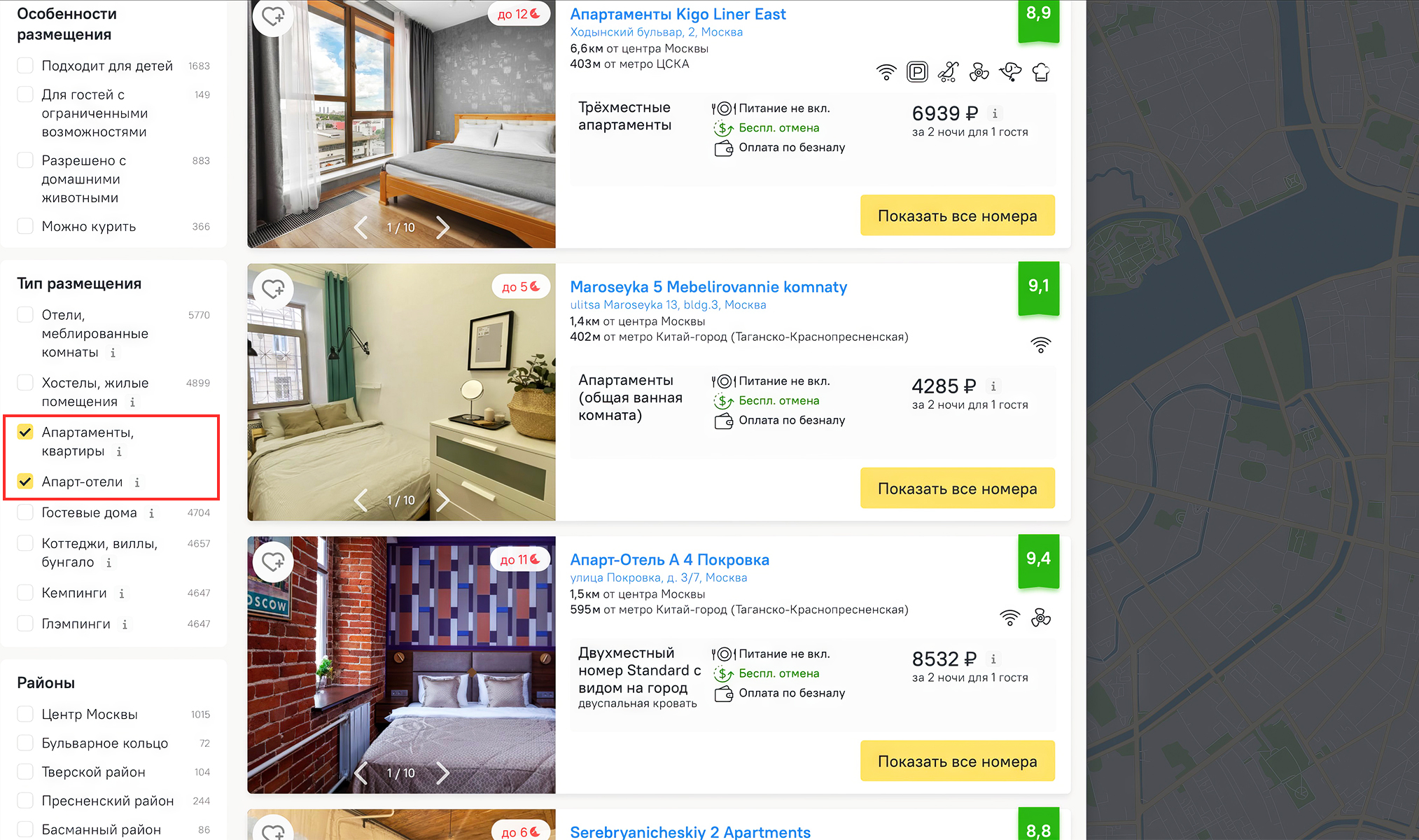 Чтобы найти подходящий вариант проживания в нужном городе, в «Типах размещения» поставьте галочку рядом с пунктом «апартаменты и квартиры» или «апарт-отели».