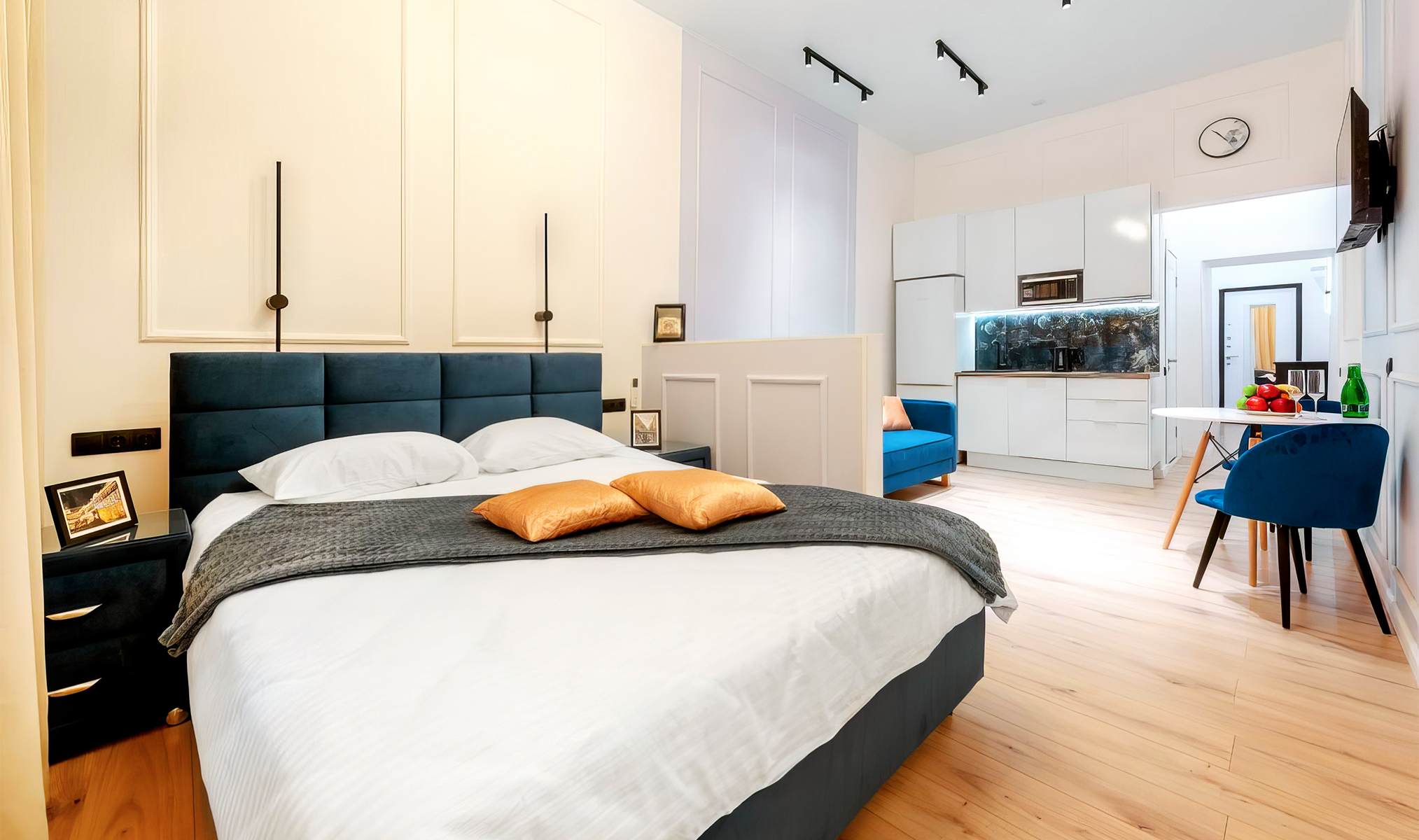 В студии есть гостиная со встроенной кухней, посудомоечной машиной и системой очистки воды.