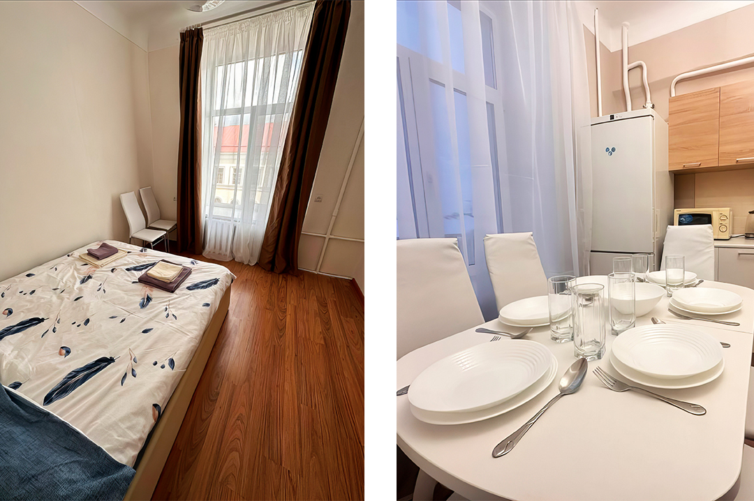 Прагматичный вариант — апартаменты находятся чуть дальше от главных достопримечательностей города, но вблизи бизнес-центра на Холодном переулке.