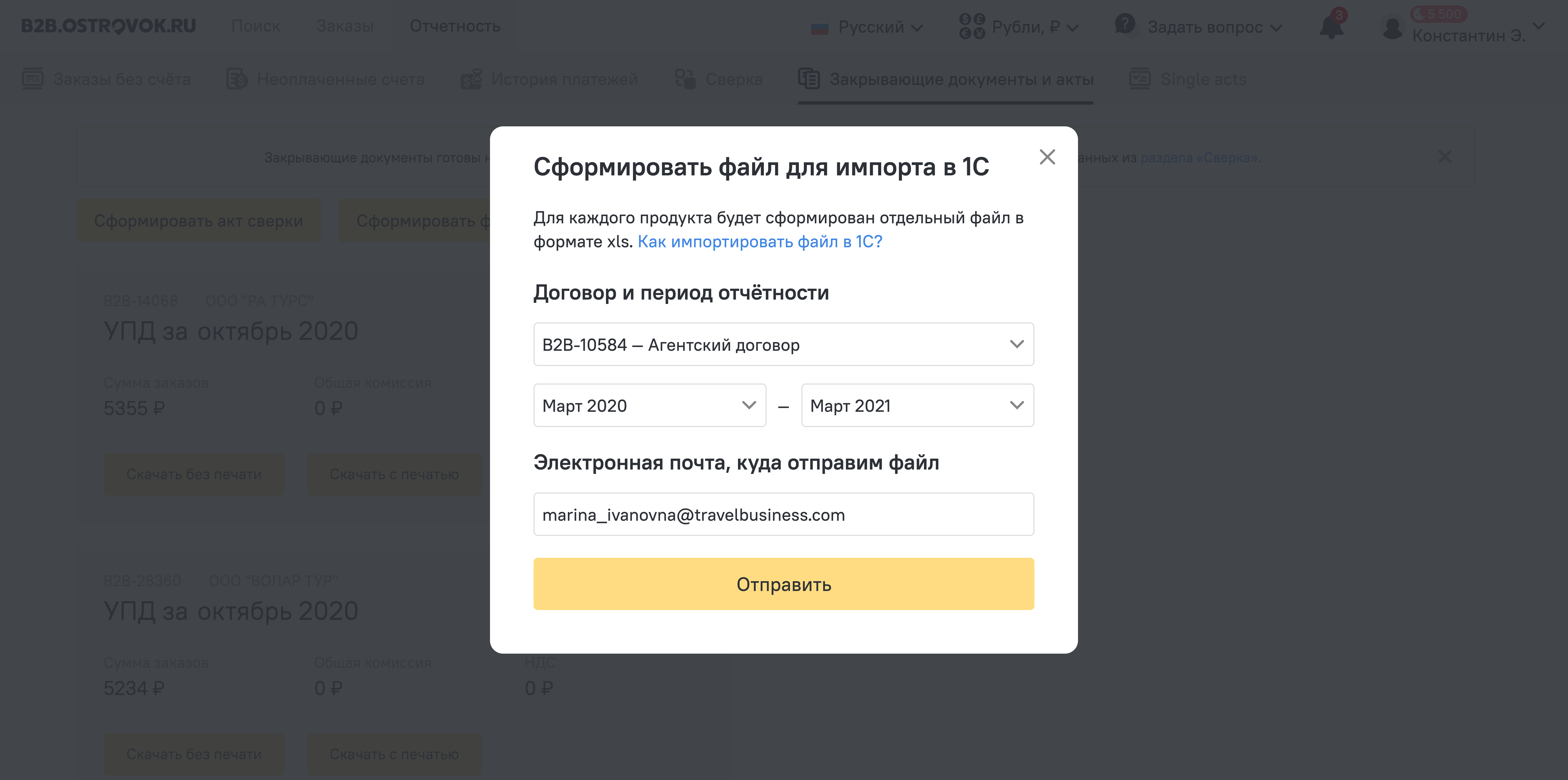 - Выберите договор и период для выгрузки.