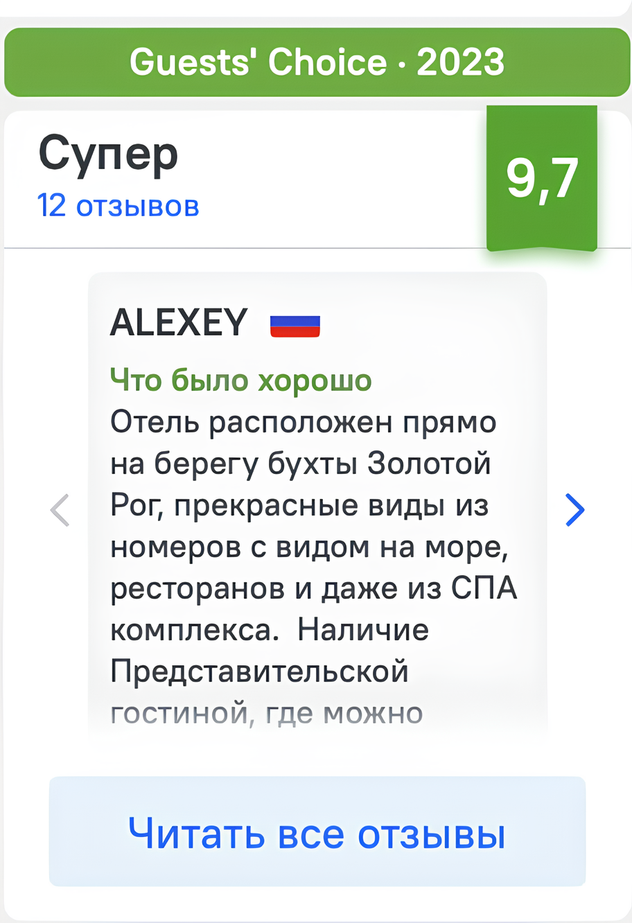 Для того чтобы получить звание победителя ежегодной премии Ostrovok Guests’ Choice, отельеры оказывают отличный уровень сервиса и совершенствуют качество обслуживания. Вы можете смело рекомендовать их своим клиентам.