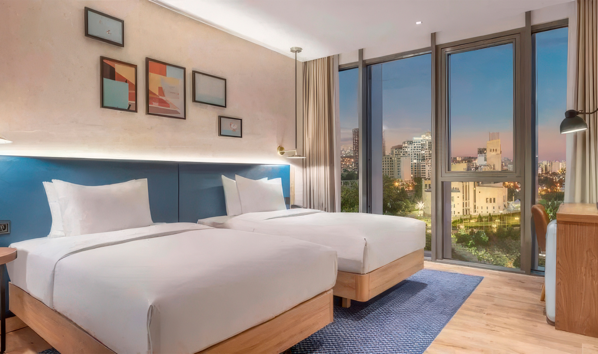 В 15-этажном отеле 160 современных номеров с панорамными окнами.