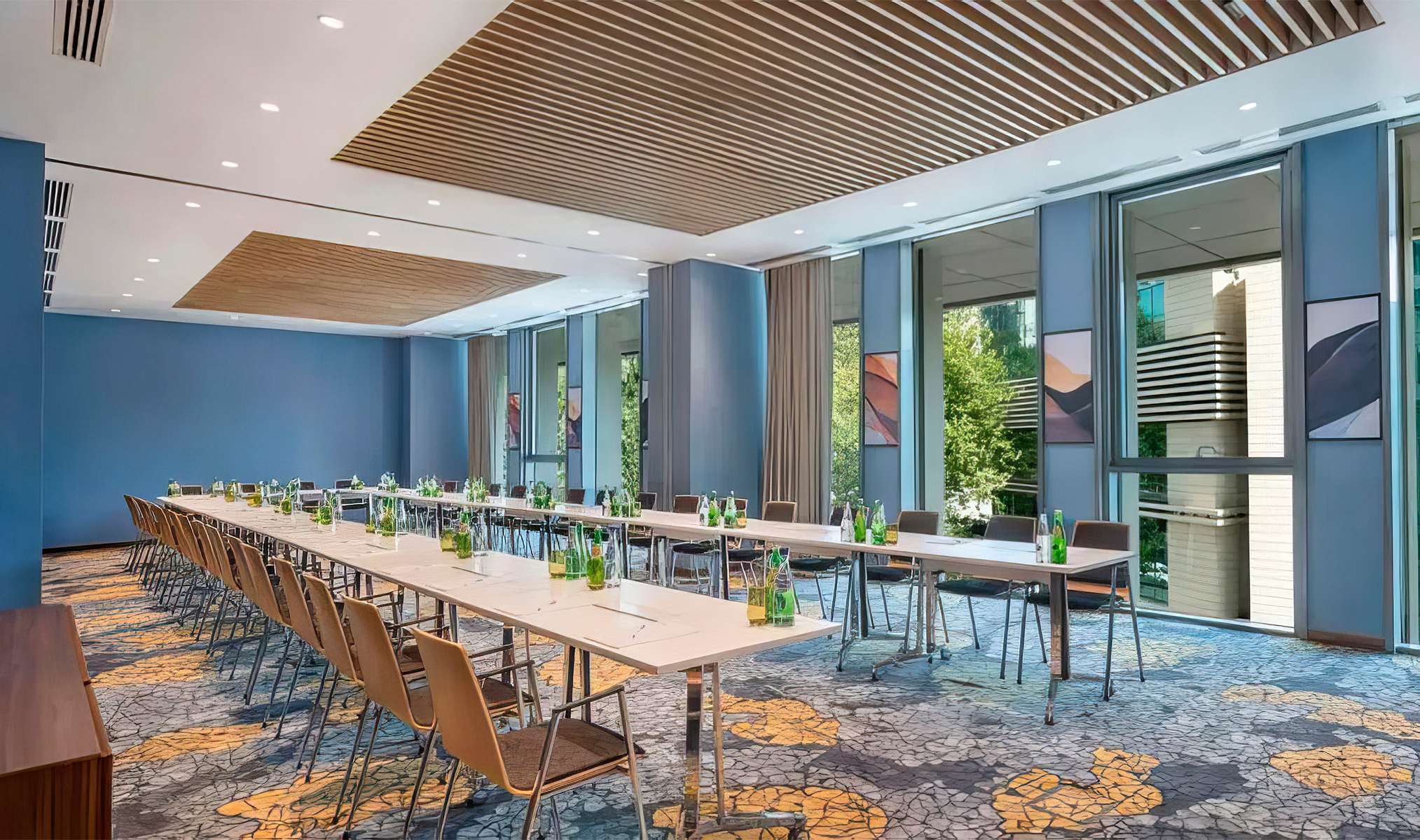 В пакет услуг входят проектор, экран и микрофоны, а для больших компаний предусмотрено объединение залов «Казбеги» и «Лейла» — получится 97 м². Дополнительно можно заказать кейтеринг: кофе-брейк или обед в ресторане отеля.