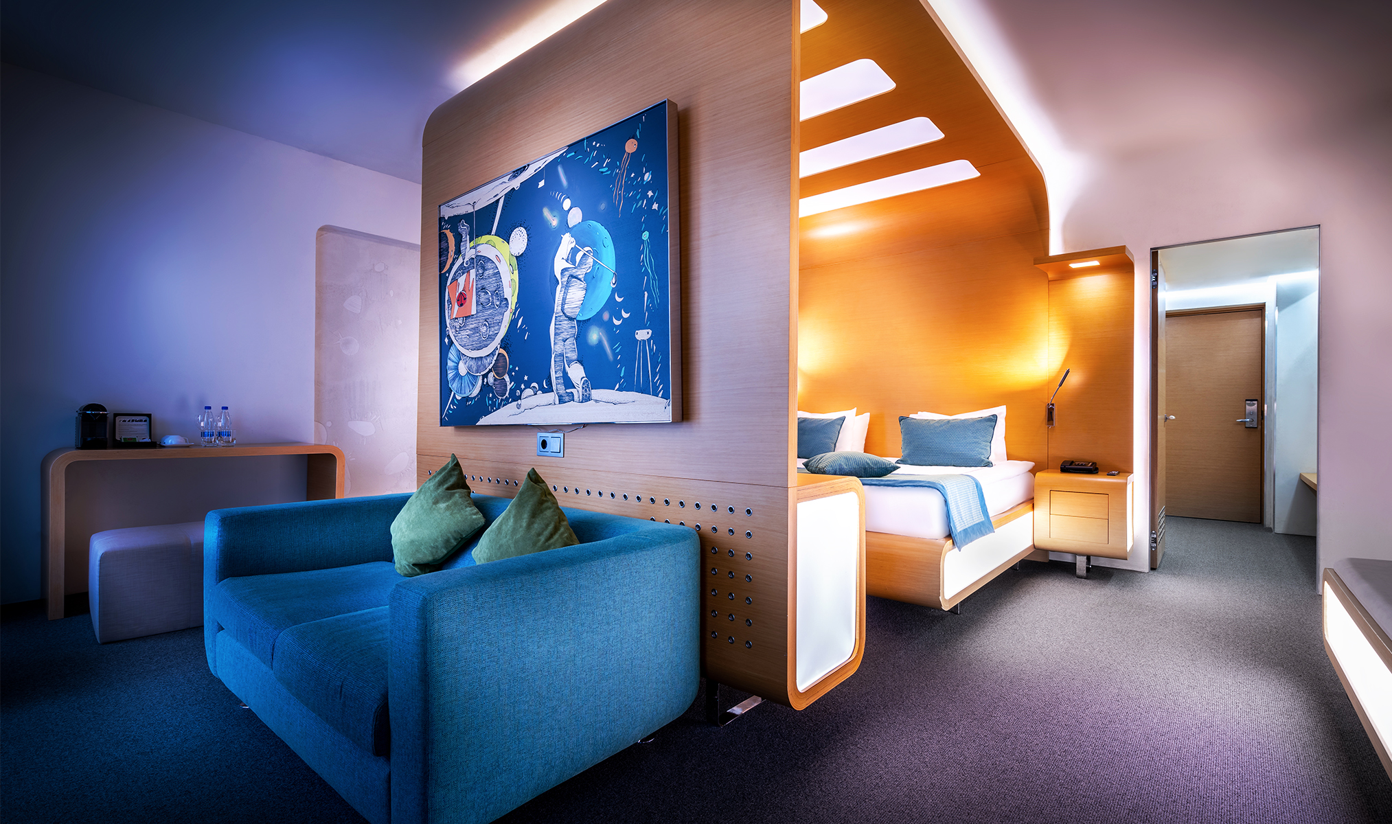 - «Делюкс» с капсулой сна в центре комнаты и эксклюзивными художественными произведениями — оптимальное сочетание удобства и эстетического наслаждения.