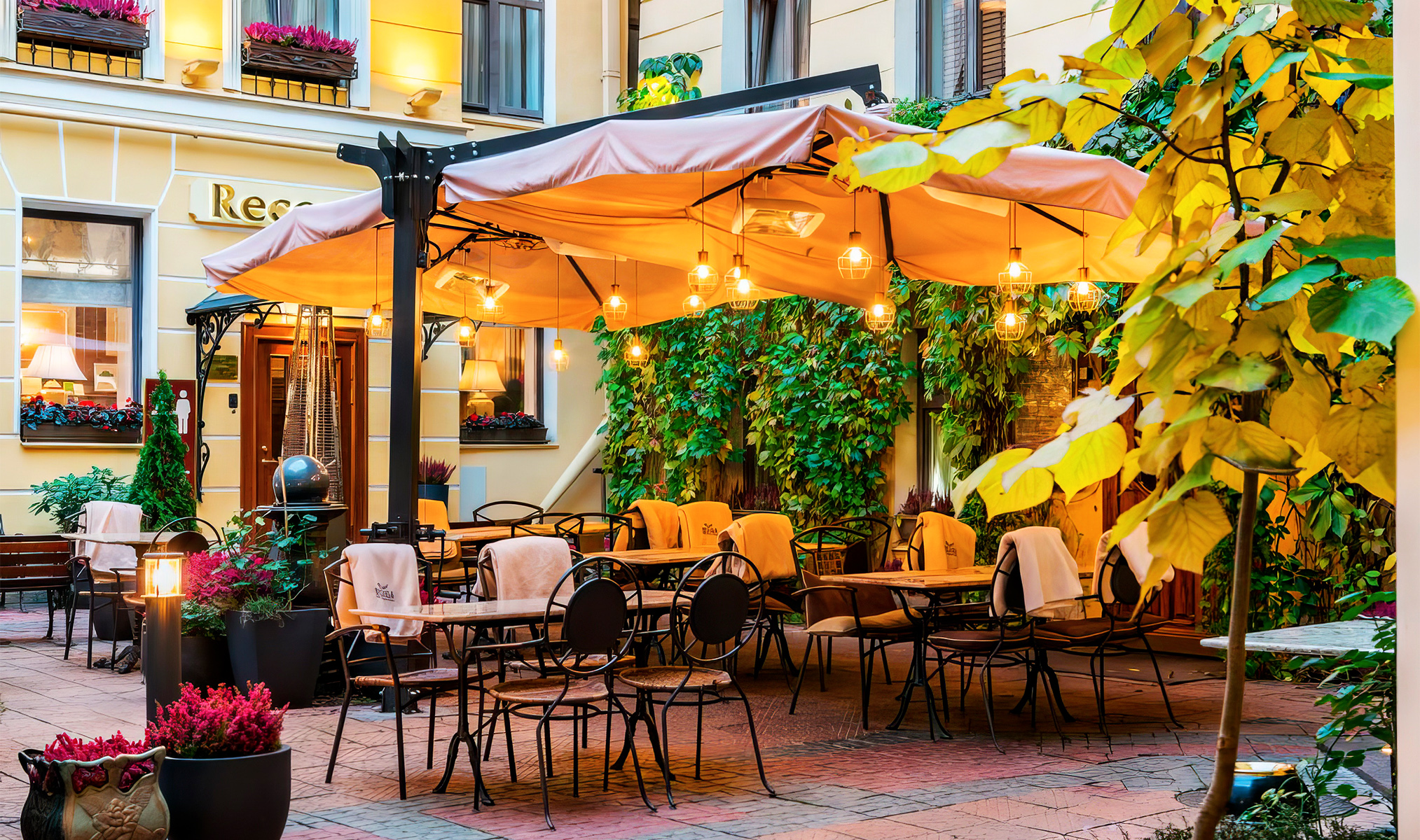 Веранда обоих заведений расположена во внутреннем дворе-колодце «Гельвеции» и принимает гостей круглый год.